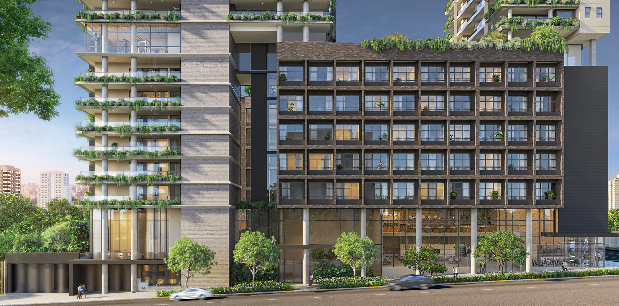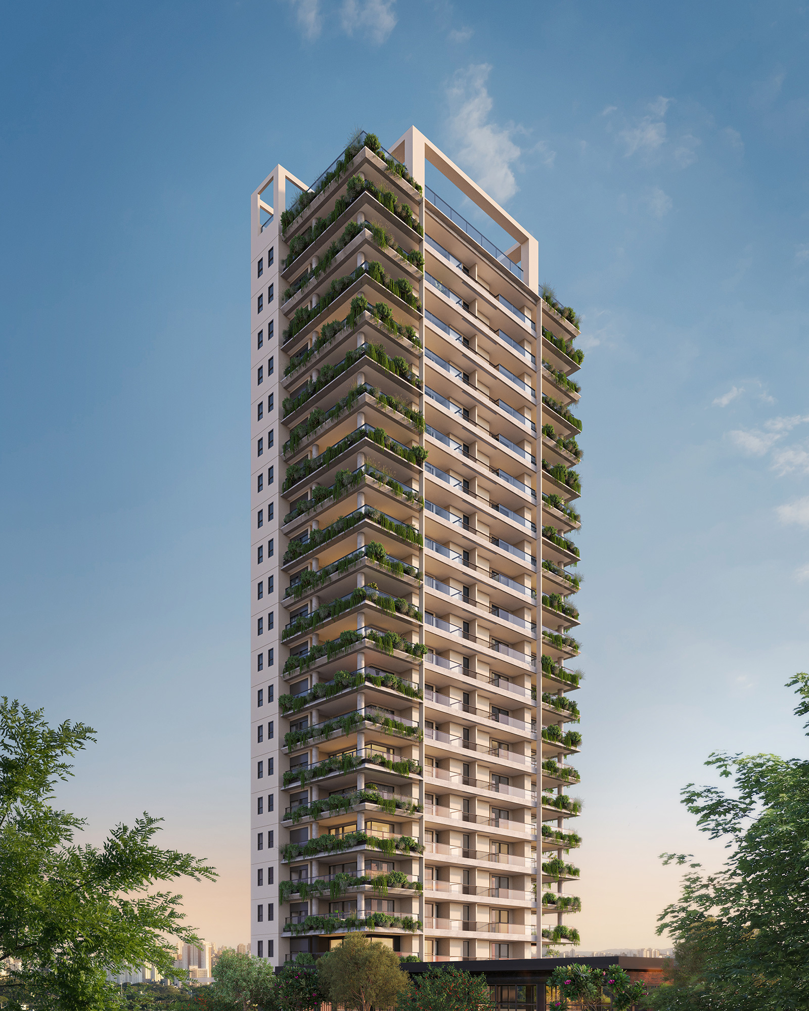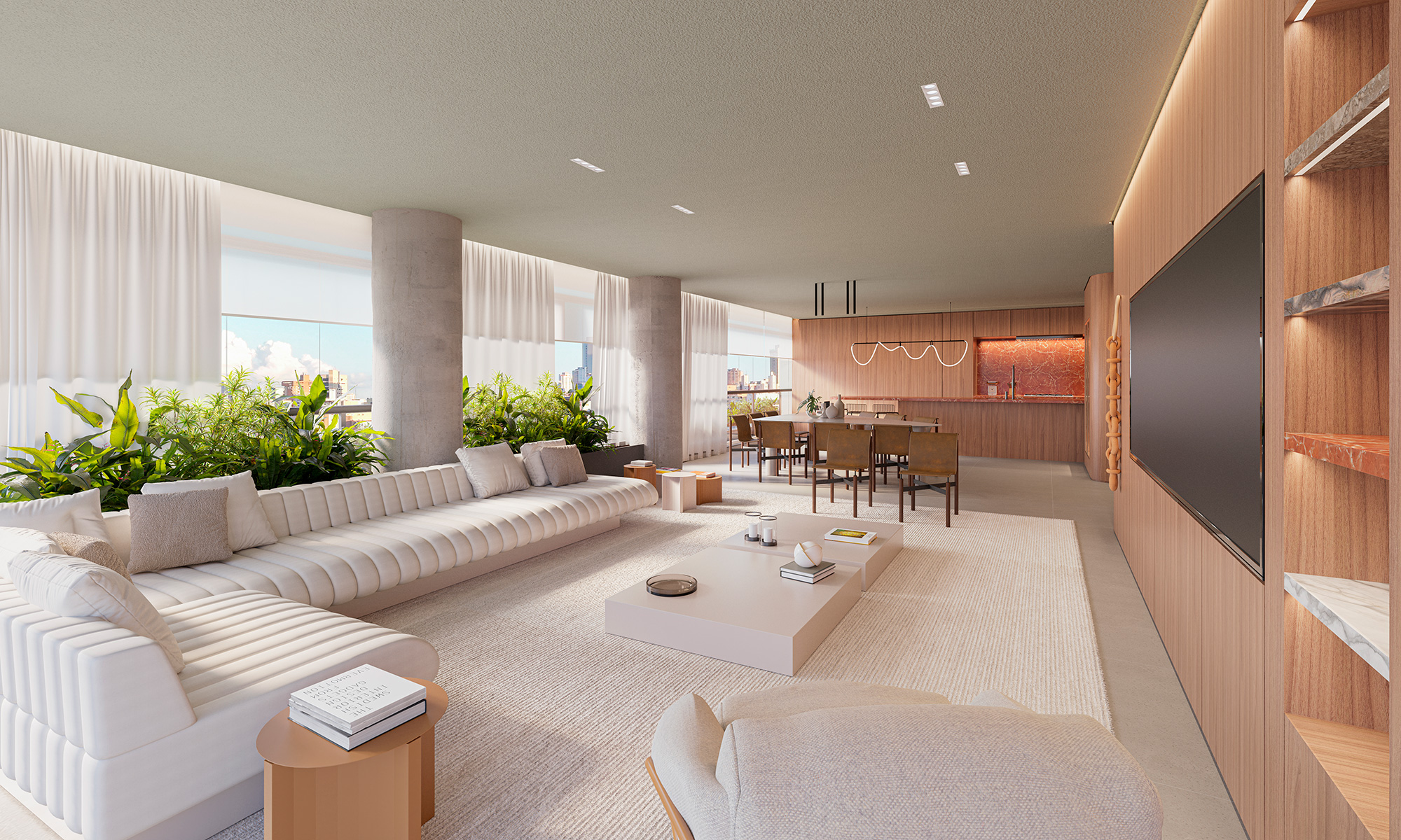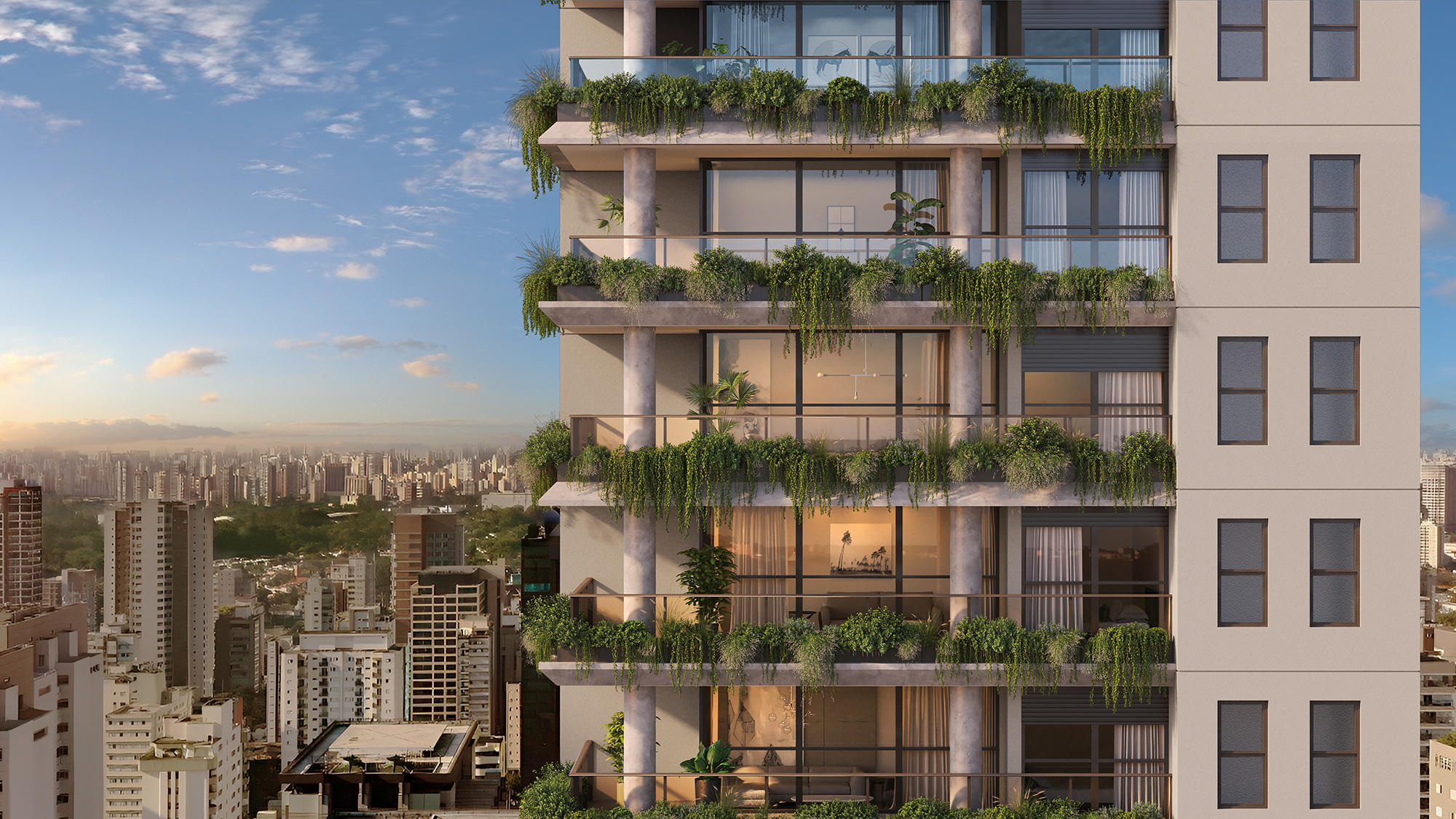"O projeto de arquitetura explora um volume no embasamento com 5 pavimentos (com apartamentos menores) que abrigam, lojas junto a calçada do térreo, o que mantém o caráter comercial típico do bairro, além dos acessos ao condomínio. Esse volume estabelece uma escala agradável ao pedestre e fica na altura das copas das árvores. Sua materialidade explora uma linguagem mais cosmopolita com acabamentos em tijolos a vista e revestimento de alumínio mini-wave, dando caráter mais contemporâneo. Nesta cobertura do embasamento teremos a área de lazer, criando uma grande cobertura verde com vista privilegiada, destacando o volume do embasamento das torres. Assim sobem dois edifícios com 2 apartamentos por andar cada, um em frente para a Avenida Ibirapuera e outro de frente para a Macuco com 100 metros de altura. Os edifícios exploram uma marcação mais horizontal dos terraços, através de um detalhe angulado. Na cobertura do edifício da Ibirapuera teremos um rooftop com piscina com vista 360 graus para a cidade que atende aos moradores dos dois edifícios. Os materiais explorados criam uma espécie de degradê na paleta de cores do conjunto, surge o concreto aparente nos detalhes angulados das lajes e revestimentos na cor branca que se contrapõe aos tijolos e painéis de alumínio com tons mais fechados. Para estimular a conexão entre a arquitetura e o meio urbano, trabalhou-se com grandes terraços implantados nas esquinas dos edifícios, garantindo o proveito máximo das vistas em duas direções. Em toda a extensão das varandas estão jardineiras que trazem a continuidade da vegetação encontrada no bairro e nas vistas."