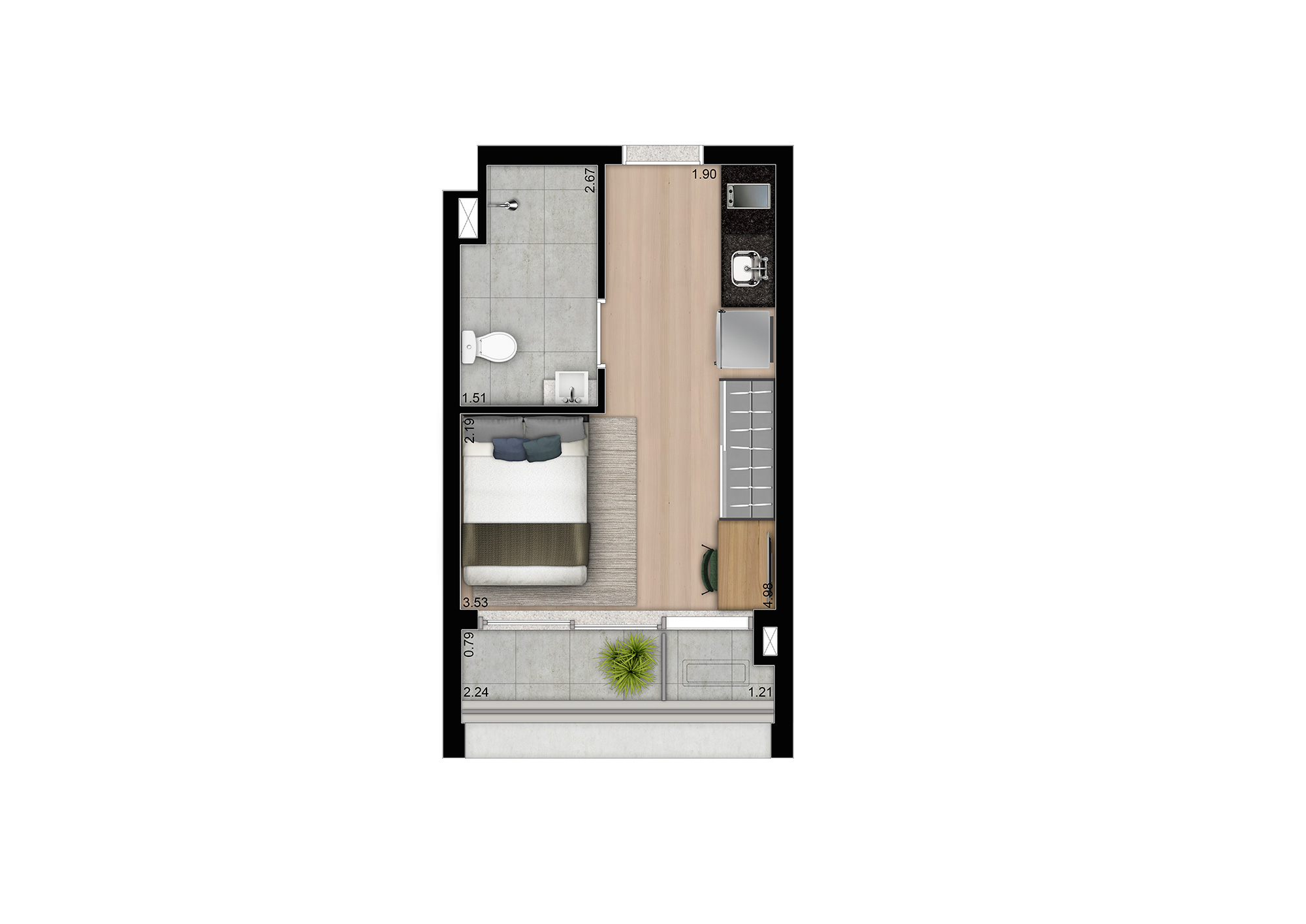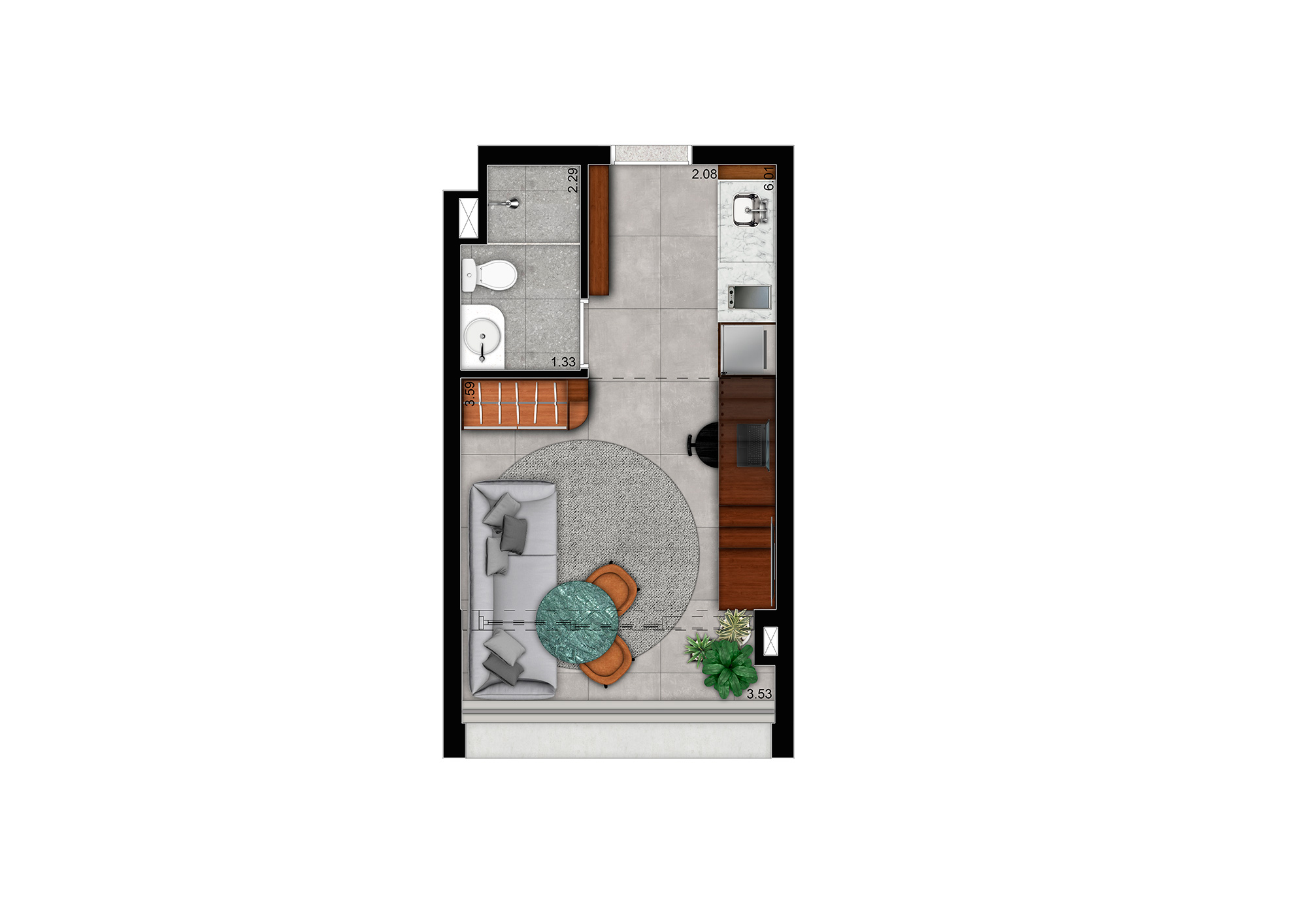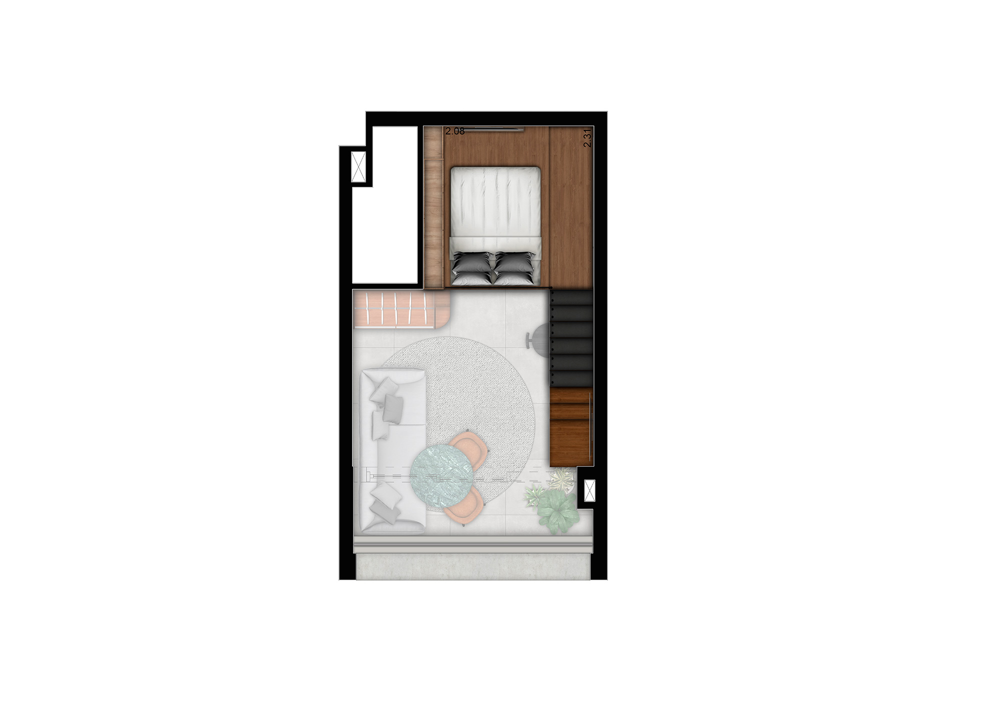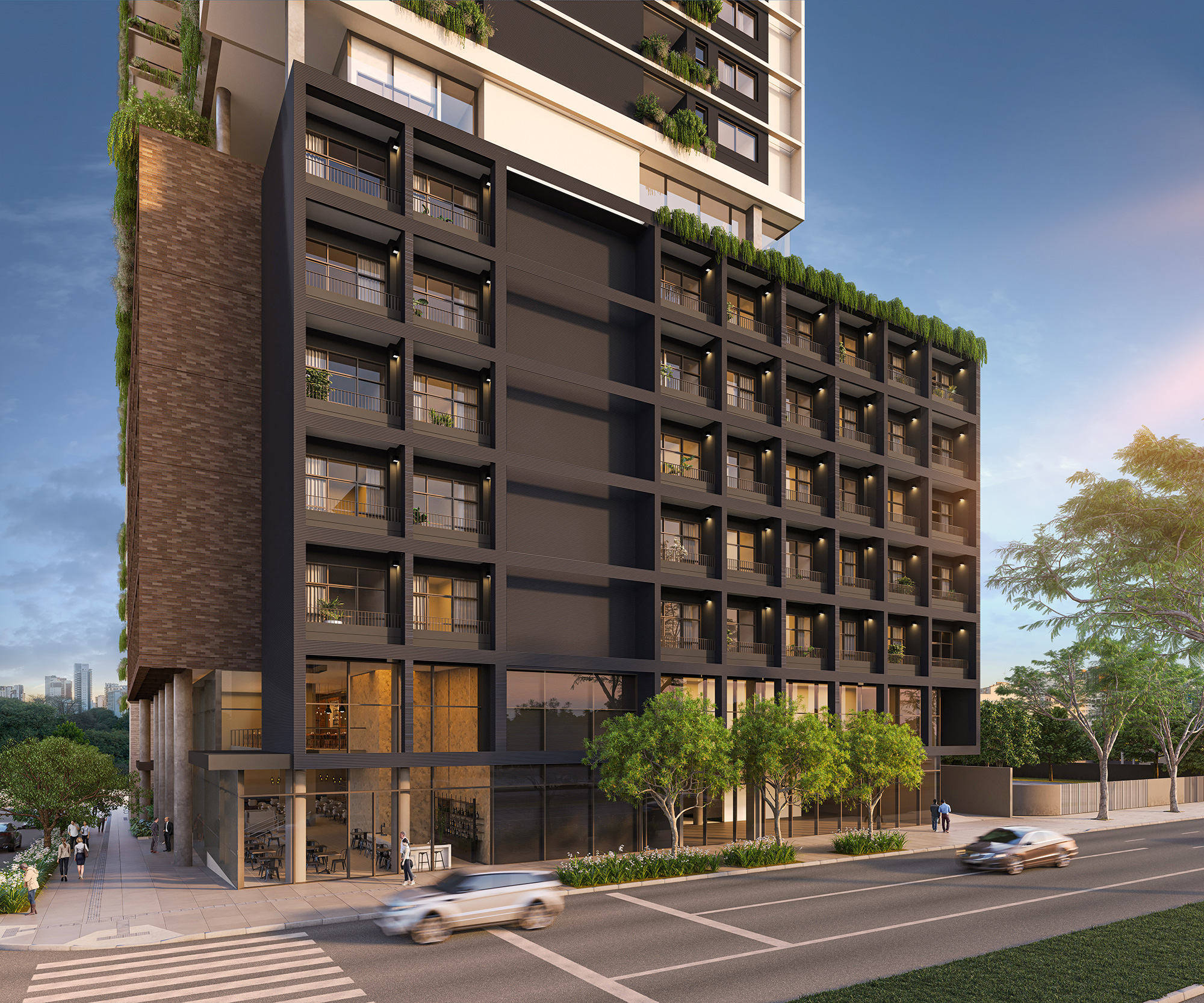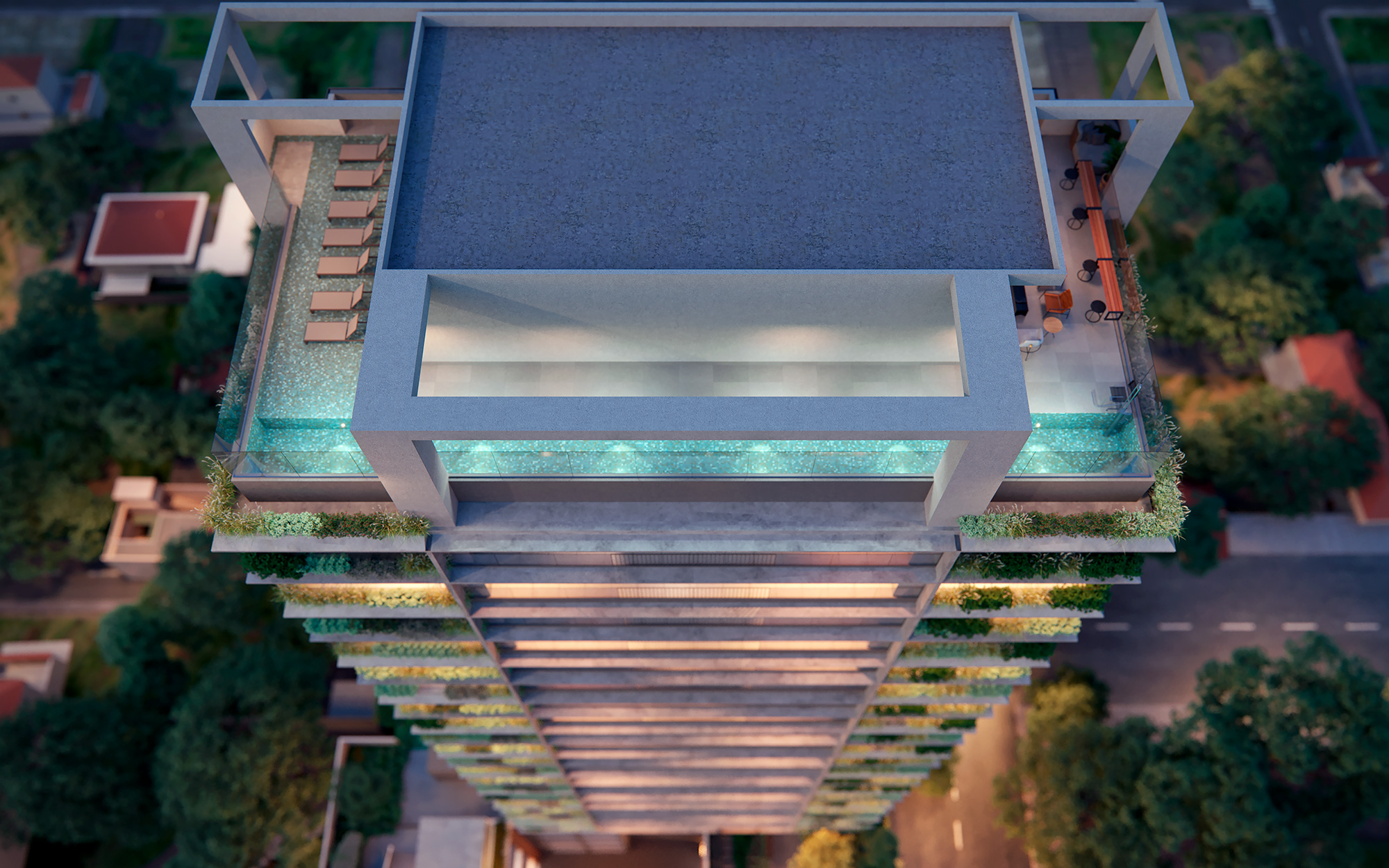 "O projeto de arquitetura explora um volume no embasamento com 5 pavimentos (com apartamentos menores) que abrigam, lojas junto a calçada do térreo, o que mantém o caráter comercial típico do bairro, além dos acessos ao condomínio. Esse volume estabelece uma escala agradável ao pedestre e fica na altura das copas das árvores. Sua materialidade explora uma linguagem mais cosmopolita com acabamentos em tijolos a vista e revestimento de alumínio mini-wave, dando caráter mais contemporâneo. Nesta cobertura do embasamento teremos a área de lazer, criando uma grande cobertura verde com vista privilegiada, destacando o volume do embasamento das torres. Assim sobem dois edifícios com 2 apartamentos por andar cada, um em frente para a Avenida Ibirapuera e outro de frente para a Macuco com 100 metros de altura. Os edifícios exploram uma marcação mais horizontal dos terraços, através de um detalhe angulado. Na cobertura do edifício da Ibirapuera teremos um rooftop com piscina com vista 360 graus para a cidade que atende aos moradores dos dois edifícios. Os materiais explorados criam uma espécie de degradê na paleta de cores do conjunto, surge o concreto aparente nos detalhes angulados das lajes e revestimentos na cor branca que se contrapõe aos tijolos e painéis de alumínio com tons mais fechados. Para estimular a conexão entre a arquitetura e o meio urbano, trabalhou-se com grandes terraços implantados nas esquinas dos edifícios, garantindo o proveito máximo das vistas em duas direções. Em toda a extensão das varandas estão jardineiras que trazem a continuidade da vegetação encontrada no bairro e nas vistas."